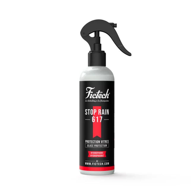 Stop Rain-617 est une protection des surfaces vitrées développée par Fictech. Il améliore considérablement la visibilité par temps de pluie, neige et verglas grâce à sa technologie conçue pour les surfaces vitrées.